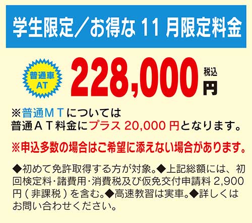 令和7年11月29日(土)までの入校で、下記料金(学生限定・総額)での免許取得を継続中。