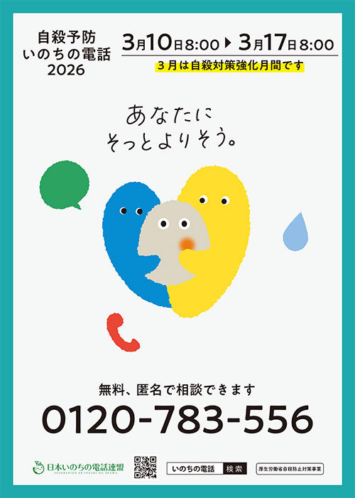 / 最終更新日時 : 「このまちでくらす」 info 【おしらせ】自殺予防いのちの電話フリーダイヤル連続168時間(3/10~3/17) いのちの電話フリーダイヤル連続168時間(3/10~3/17) 3月は自殺対策強化月間です。3月10日(火)8:00から3月17日(火)8:00までの7日間、168時間連続で「自殺予防いのちの電話」を実施いたします。【期間】2026年 FacebooktwitterHatenaPocket