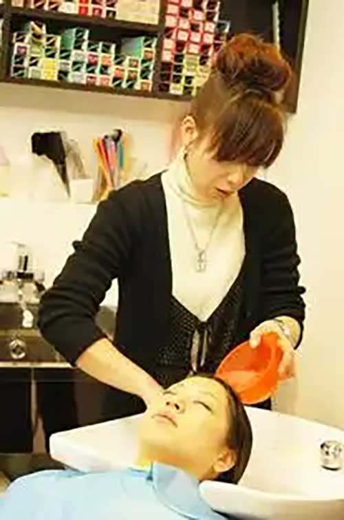 殺菌・消炎作用のある40℃前後のオゾン水を髪にかけていき、